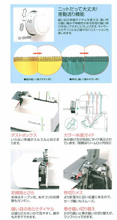 商品情報 メーカー ジャノメ(JANOME) サイズ 幅32,1cm 奥行28,4cm 高さ28,0cm 質量6,5kg 針:HA×1SP使用 仕様 縫い速度:1,300針/分差動比:0,5〜2,25使用針:HA×1SP(#11、#14)切り幅調節量:3,1mm〜5,1mm【ミシン】【送料無料】【5年保証】 ジャノメ 1本針3本糸 差動付き オーバーロックミシン DL33D (ドリームロック DL-33D) 【smtb-MS】【RCP】【最安値挑戦】 【ジャノメミシン】【ロックミシン】【手芸用品】【ミシン本体】 手作りの夢をかなえるドリームロックシリーズ! ジャノメファンの方には必見のロックミシンDL-33D!ニットだって大丈夫な差動送り・・・糸のかけ方はカラー糸道ガイドでご案内・・・布屑はダストボックスできれいにまとめる・・・お掃除とびらで、糸ぼこりのお掃除も簡単・・・ここがおススメ→針落ち位置が布切メスに近いためカーブ縫いもラクラク! カーブ縫いが縫いやすい! ダストボックス標準装備! ワンタッチ巻縫い切り替え! ニットソーイングに挑戦 家庭用ミシンだけでは物足りない ワンランク上の作品作りに こんにちは!店長の澤村です!ジャノメのロックミシンの中でもこのドリームロックは一番使いやすく性能も抜群です!縫いを一番に考えた仕様になっておりますので安心してお使い頂けます! 即〜4営業日以内の発送になります。
